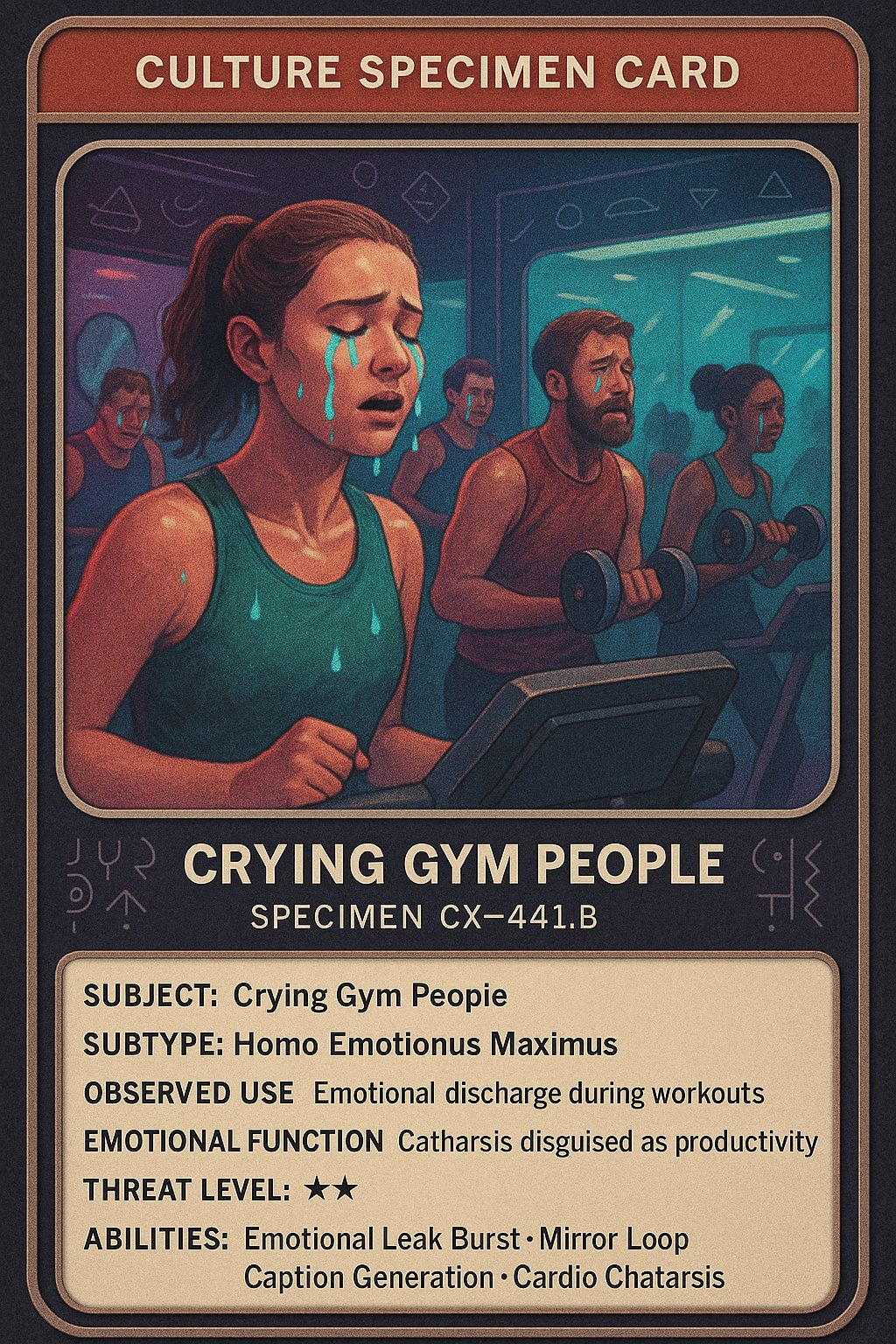 Emotional fitness rituals spike as humans post tear-soaked gym selfies.